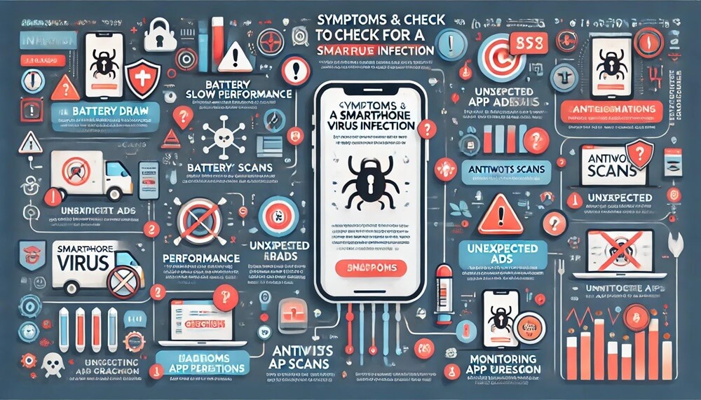 Androidウイルス感染の症状と確認方法として、データ通信量の増加、バッテリー消耗の早さ、見に覚えのない請求、不明なアプリの存在、頻繁な偽警告メッセージ、端末のパフォーマンス低下が挙げられます。