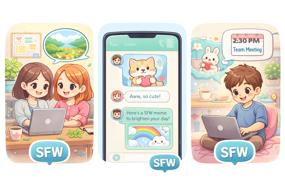 また、チャットや掲示板型のコミュニティでは、質問や相談を投げかける際に 「Is this SFW?(これはSFWですか?)」 と確認するケースも珍しくありません。閲覧者側も事前に確認できるため、文化や価値観の違いによるトラブルを避ける効果があります。